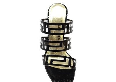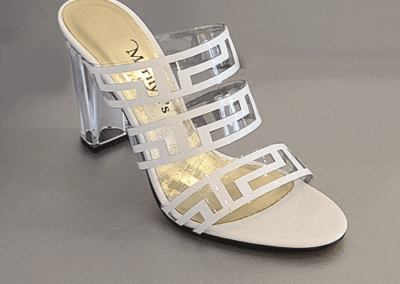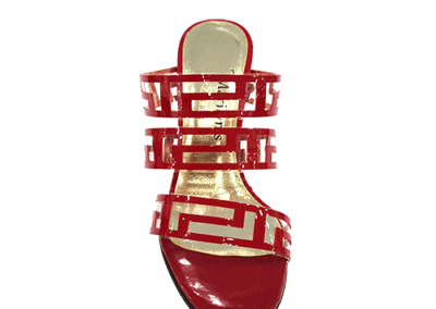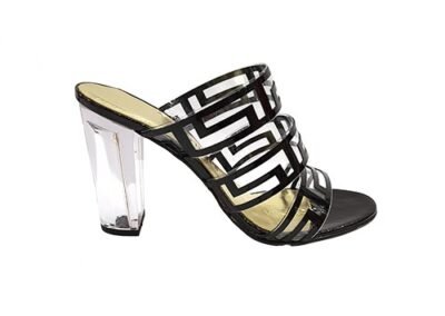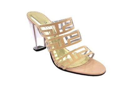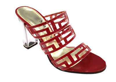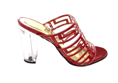 In detail, the shoe is made of patent leather. It has a heel that measures 3.5 inches high and is also open toe and slip on. And the heel is available in four colors: black,