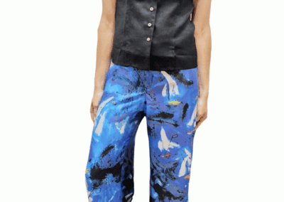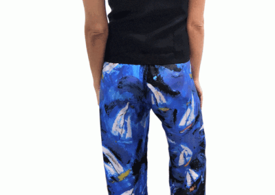 Marilyn's French boat print silk pant is an original design from Loup-Maison, otherwise known as Blandine Laneyrie Della Torre. Della Torre believes that luxury is art, beauty, and emotion and is a way to dream freely. She breathes life into her creations and this top is no exception. This dress features a beautiful ocean blue boat print. The design evokes elegance and peace.