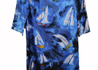 In detail, the dress is made with 100% silk. It also has a v-neckline and half sleeves. The dress is available in three beautiful prints: yellow with ladies pictured wearing hats, blue with sail boats, and an abstract orange pattern.