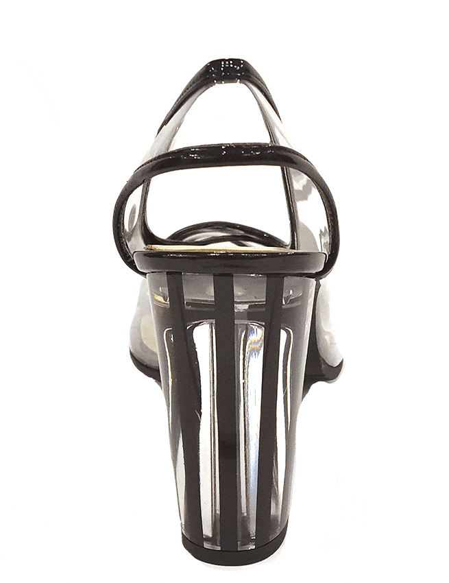 In detail, the shoe is made of patent leather. It has a block heel that measures 3 inches high and is also open toe with a sling back strap.
