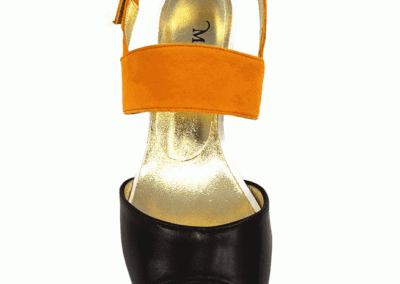 In detail, the open toe shoe is made of genuine leather with suede upper and ankle straps. The ankle strap is adjustable for desired fit and comfort. It has a block heel that measures 2.5 inches high and 1.75 inches wide. The shoe comes in two color options: orange and blue.