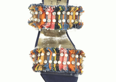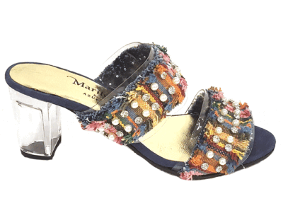 Marilyn's French jean crystal heel is an integration of European style and fun! The crystals and multi-color jean fabric that adorns the straps are sure to make a statement!