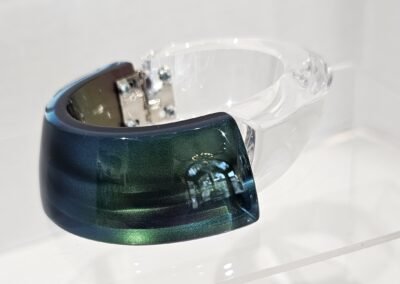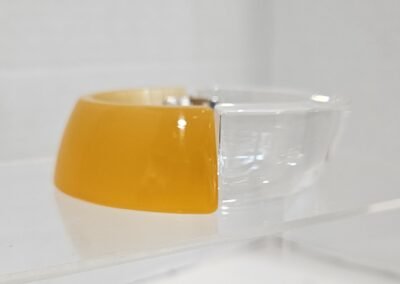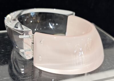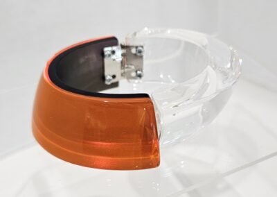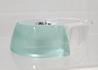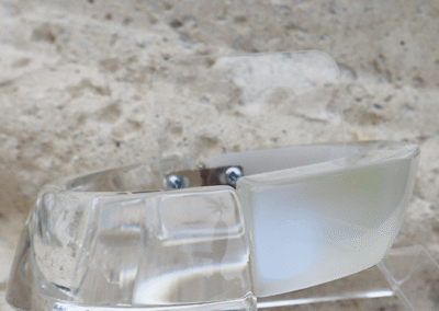These pieces are carved and shaped by hand from hard materials. Without molding, we create our material based on leaves and blocks. After machining, sanding, and polishing, the shape becomes transparent. The line of the jewel then proposes a trajectory to the light.