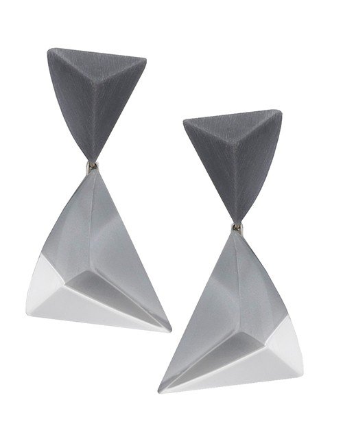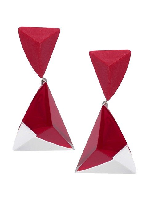 In detail, these earrings are geomterically shaped and available in clip with a silicone backing. They come in six color options: red, gold, black, white, silver, and grey.