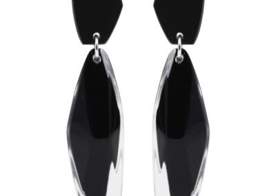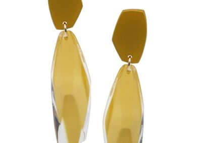 Marilyn's French plexiglass earrings MX664 are truly one of their kind. They shine so vibrantly in the sunlight and are very lightweight for easy, comfortable wear. Each earring is carved by hand from hard materials in France. The material starts as leaves and blocks, and then is followed with some machining, sanding, and polishing to make it transparent. From there, it is molded and carved into geometric shapes.