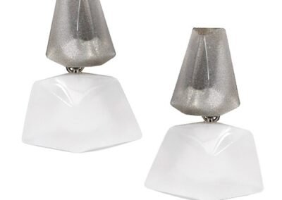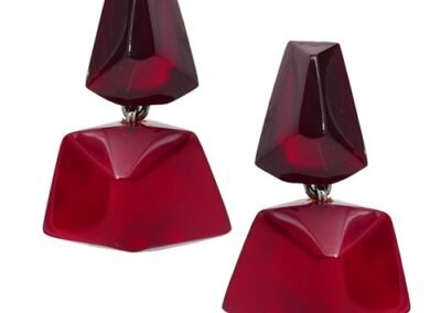 Marilyn's French plexiglass earrings MX691 are truly one of their kind. They shine so vibrantly in the sunlight and are very lightweight for easy, comfortable wear. Each earring is carved by hand from hard materials in France. The material starts as leaves and blocks, and then is followed with some machining, sanding, and polishing to make it transparent. From there, it is molded and carved into geometric shapes.