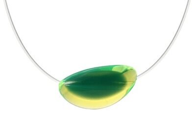 In detail, the necklace is available in two color options: orange and green. And it has a magnetized fastener with a round neckline.