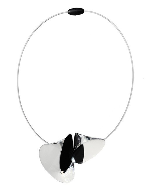 Marilyn's French plexiglass necklace MX407 is truly one of its kind. It shines so vibrantly in the sunlight and is very lightweight for easy, comfortable wear. The necklace is carved by hand from hard materials in France. The material starts as leaves and blocks, and then is followed with some machining, sanding, and polishing to make it transparent. From there, it is molded and carved into geometric shapes.