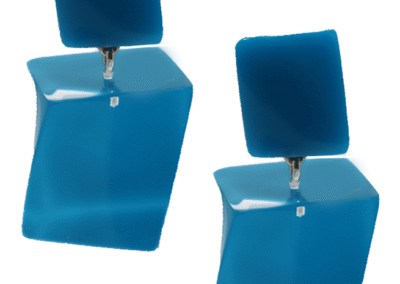 In detail, these earrings are box shaped. They are pierced with a silicone backing. And are available in six colors: blush, turquoise, gold, red, white, and silver.