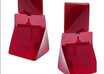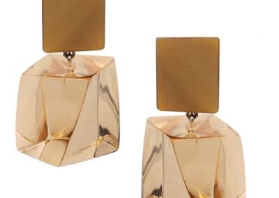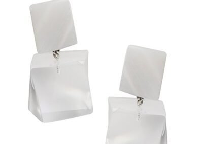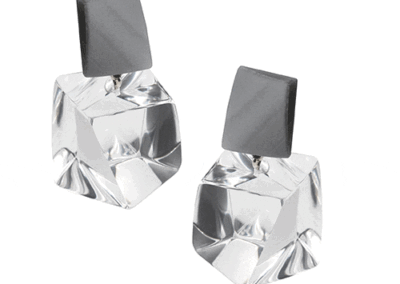 Marilyn's French plexiglass pierced earrings MX326 are truly one of their kind. They shine so vibrantly in the sunlight and are very lightweight for easy, comfortable wear. Each earring is carved by hand from hard materials in France. The material starts as leaves and blocks, and then is followed with some machining, sanding, and polishing to make it transparent. From there, it is molded and carved into geometric shapes.