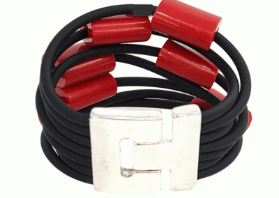 In detail, the bracelet comes in three color combinations: red, silver and clear. Additionally, it is made up of resin tubing and cylinder beads. And the bracelet is enclosed with a magnetic clasp for comfortable, easy wear.