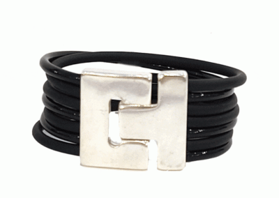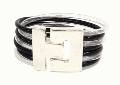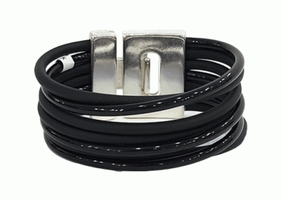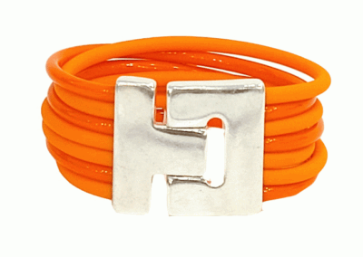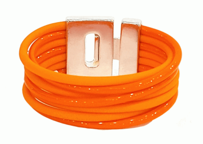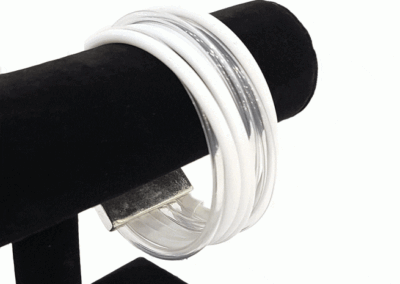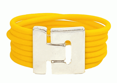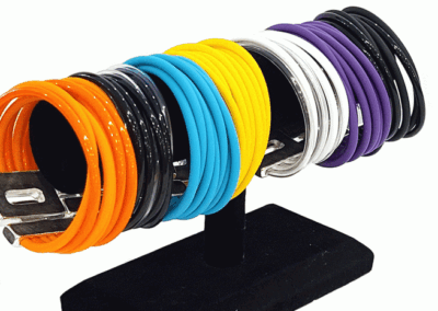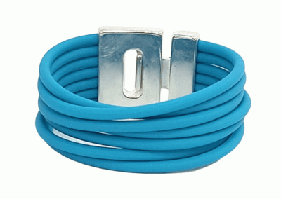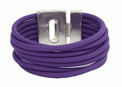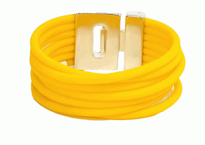 In detail, the bracelet comes in seven color combinations: purple, orange, yellow, black, turquoise, clear, and white. Additionally, it is made up of resin tubing and enclosed with a magnetic clasp for comfortable, easy wear.