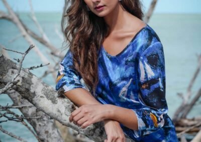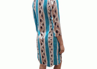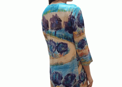 In detail, the dress is made with 100% silk. It has a boat neckline and 3/4 sleeves. The dress comes in four print options: road, boat, fire, and line.
