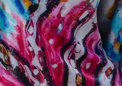 Marilyn's French stretch silk dress is an original design from Loup-Maison, otherwise known as Blandine Laneyrie Della Torre. Della Torre believes that luxury is art, beauty, and emotion and is a way to dream freely. She breathes life into her creations and this dress is no exception. This dress features a vibrant print that seems to burn with colors and embers. The design evokes power and elegance.