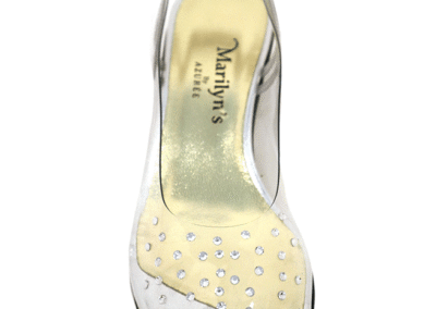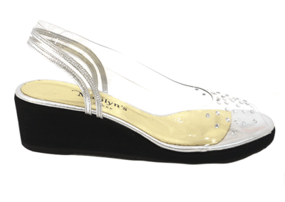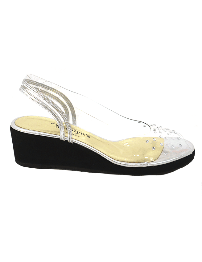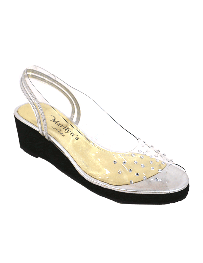 Marilyn's French white crystal wedge is an integration of European style and comfortability. This shoe sports a black and white, elegant look with crystal adornments. It can be worn for a nice dinner or a fancy night out!