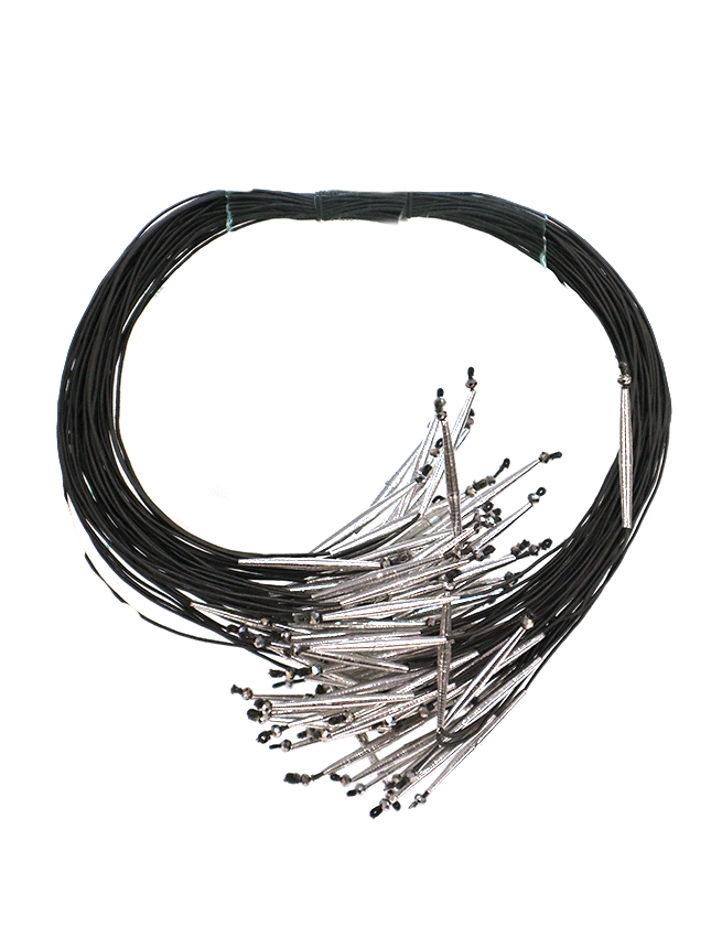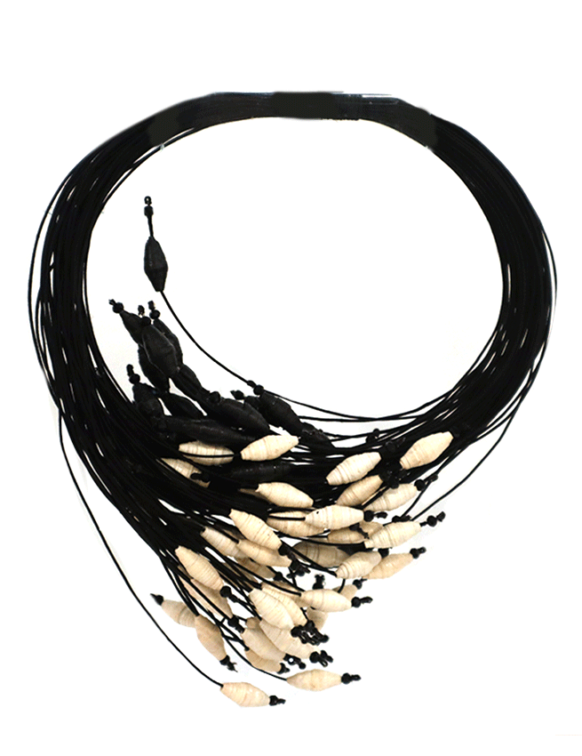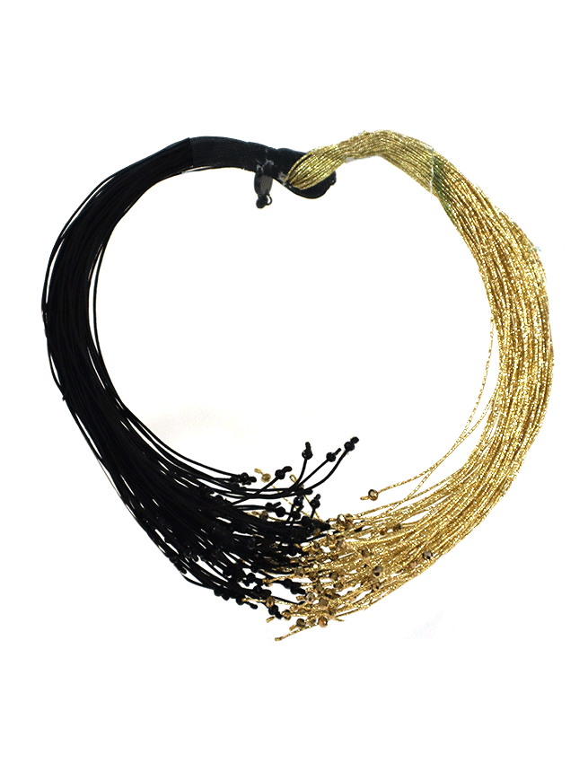 In detail, the necklace is made from stones, metallic crystals, and silk threads. The threads are flexible and very lightweight. And the necklace is available in three color options: silver, gold, and ivory.
