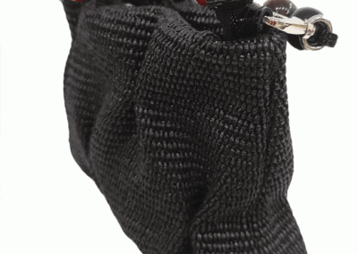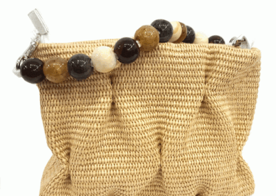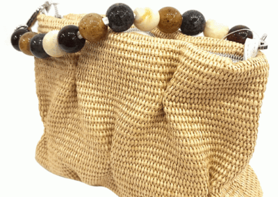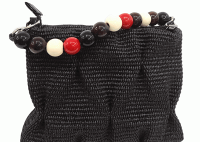 In detail, this handbag comes in four colors: black, white, taupe, and wheat. It is handcrafted in Milan and made with a nylon and cotton weave. The handbag features a beaded handheld strap and it has a detachable leather crossbody strap for desired comfort. The inside is lined with fabric, opens by a working zipper, and has four pockets for additional storage.