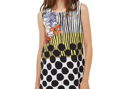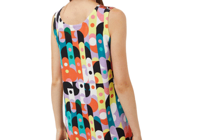 In detail, the dress is reversible with complimentary patterns of half moons and dots and stripes. It has a round neckline, sleeveless, and falls above the knee. And the dress is available in two color options: black and blush.
