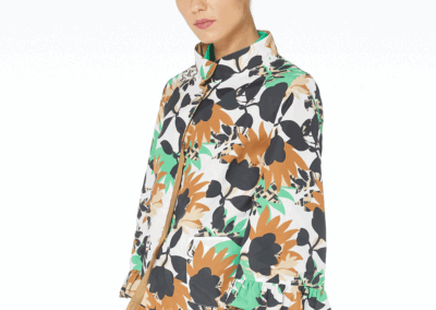 Marilyn's Italian Kelly green jacket is a one of a kind wardrobe piece. Its design is innovative and chic, making it your new favorite go-to. The floral and leaf pattern features rich colors of green, tan, white, and black.