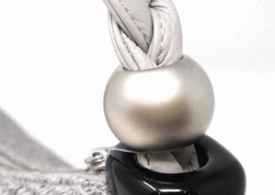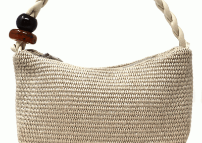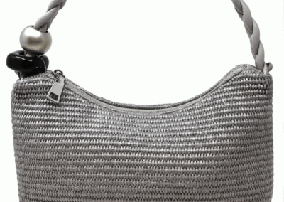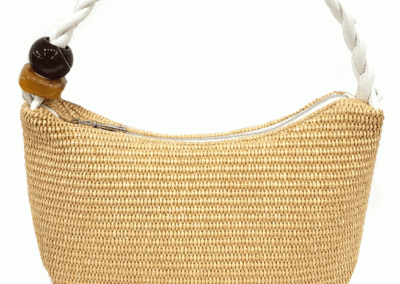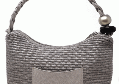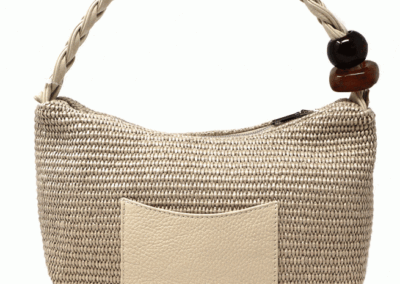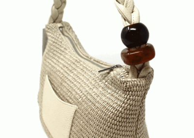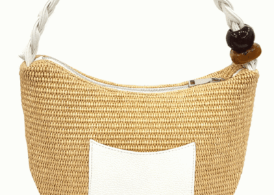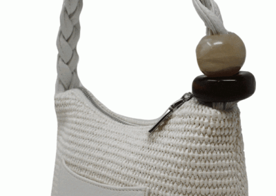 In detail, this handbag comes in four colors: white, wheat, beige, and grey. It is handcrafted in Milan and made of embossed leather with nylon and cotton weaving. The handbag features a leather handheld strap with bead accents and it has a detachable leather crossbody strap for desired comfort. The inside is lined with fabric, opens by a working zipper, and has three pockets for additional storage. Also, there is a small pocket on the outside of the handbag for added style and storage.