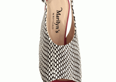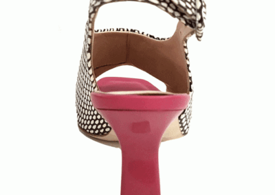 In detail, the heel is made of genuine Italian leather with a black and white dotted print. It has a rectangle heel that measures 3.5 inches high. And the shoe is a square, open-toe and has an adjustable ankle strap for comfortable wear.