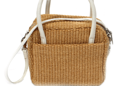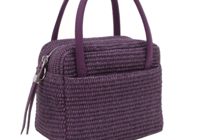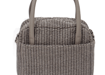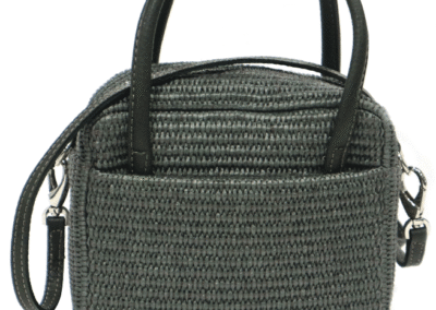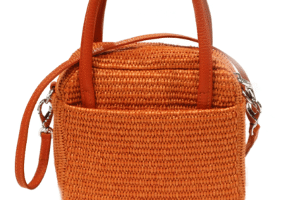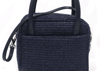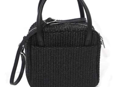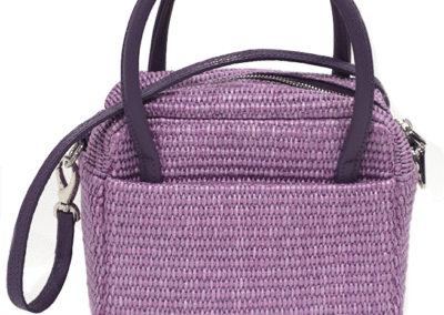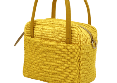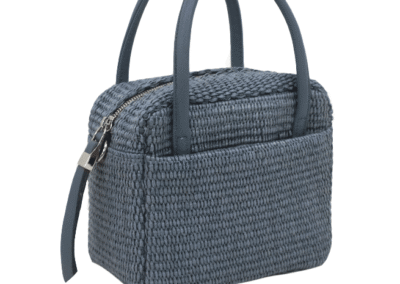 In detail, this handbag comes in eleven colors: yellow, black, wheat, purple, blue, navy, orange, lavender, green, beige, and grey. It is handcrafted in Milan and made of embossed leather with nylon and cotton weaving. The handbag features leather handheld straps and it has a detachable leather crossbody strap for desired comfort. The inside is lined with fabric, opens by a working zipper, and has a pocket for additional storage. Also, there are two pockets on the outside of the handbag for added style and storage.