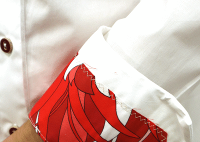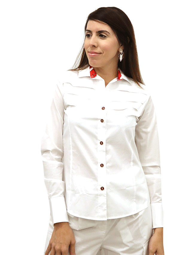 In detail, this blouse features a sharp, all white look with long sleeves that can be cuffed and a pleated front. It is a fitted style with 95% cotton and 5% stretch. And, the blouse features a gorgeous red trim under the collar and the cuffs.
