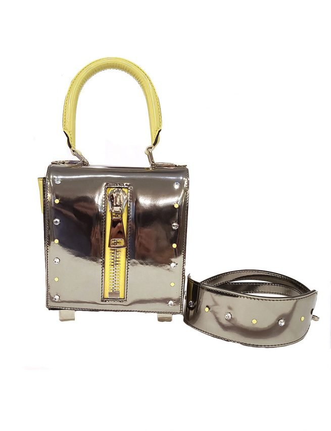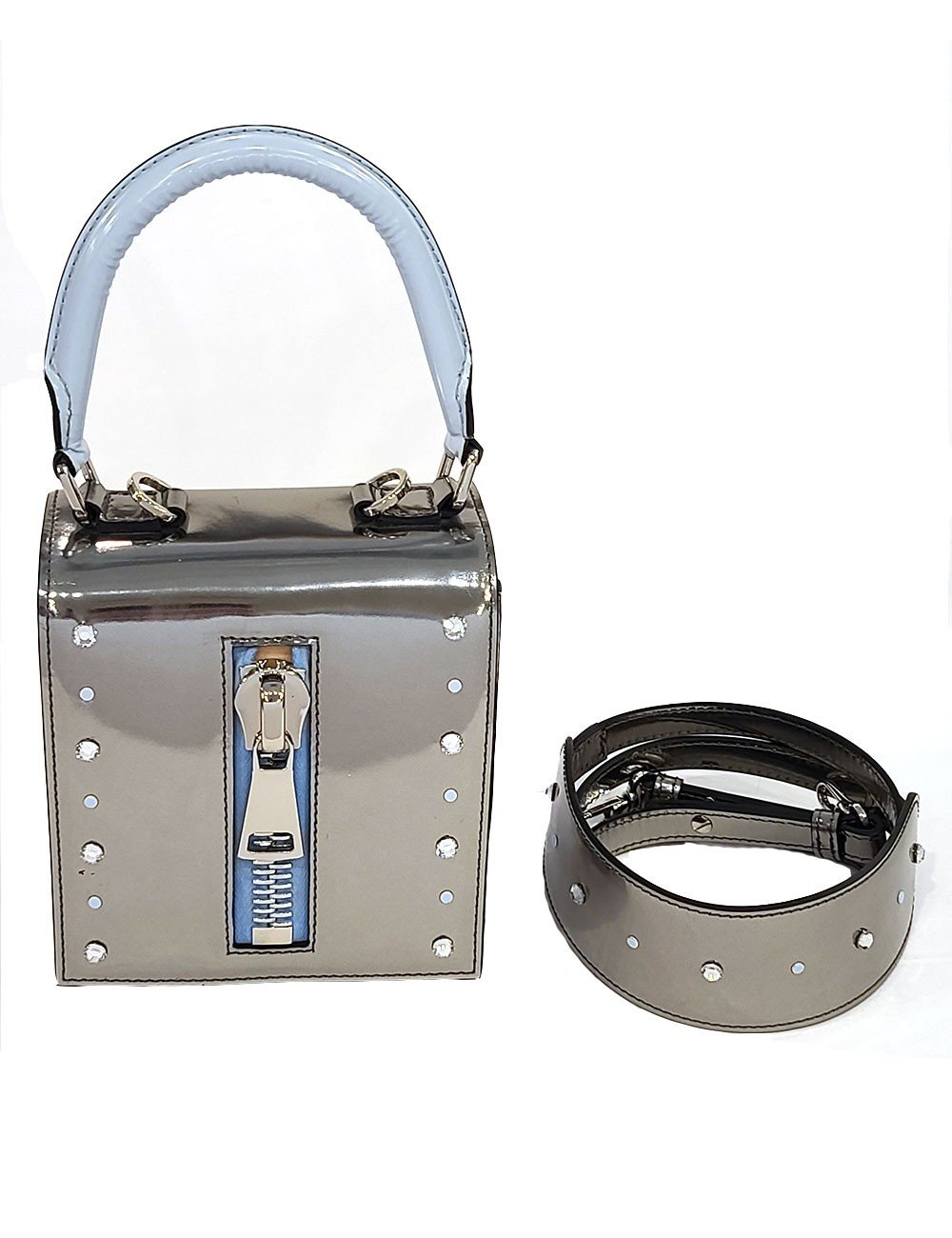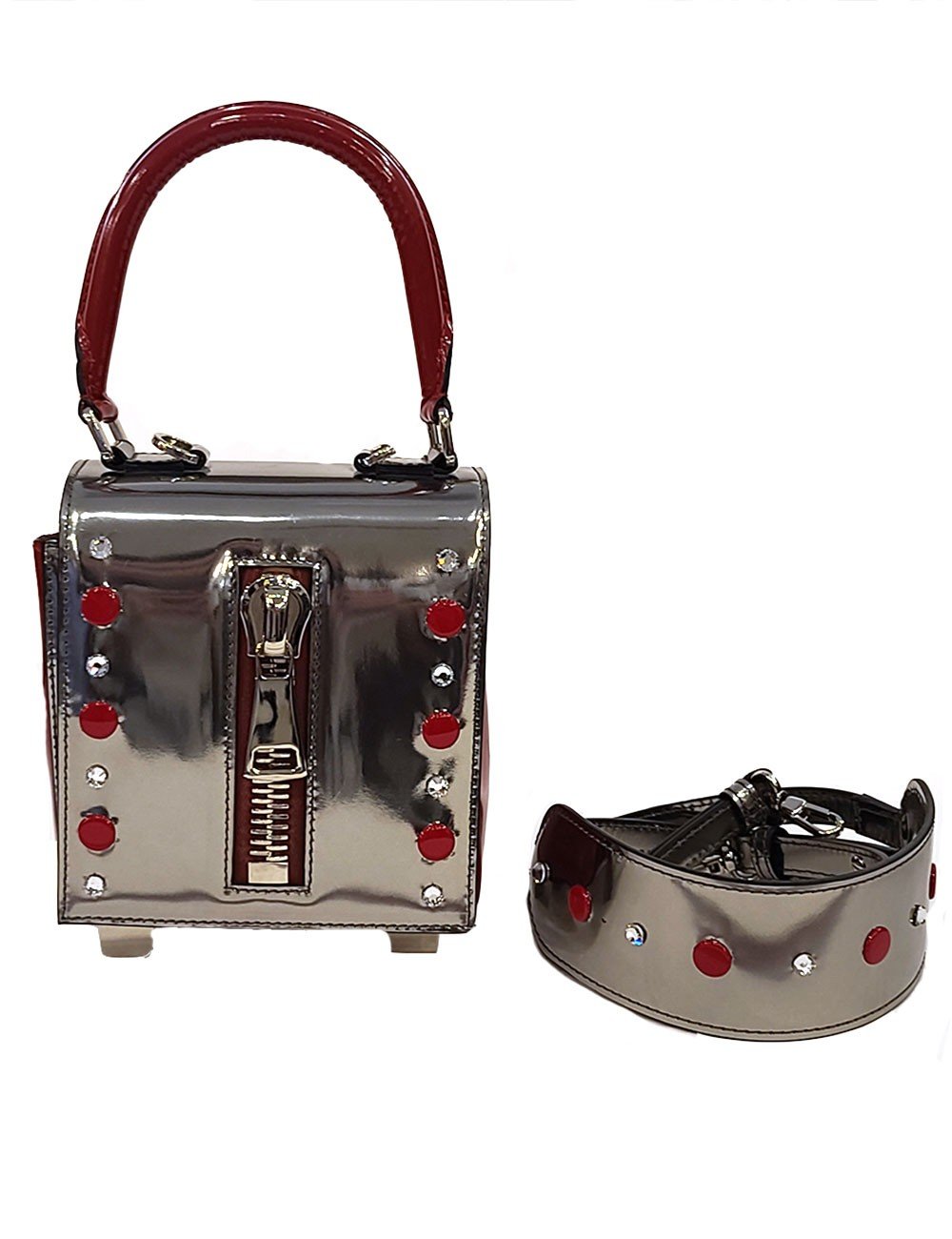 In detail, the handbag is made with genuine Italian leather and craftmanship. The rigid handle is hand-sewn and features a non-functioning, large front zip. There are decorative Swarovski crystals along the front panels of the bag. Further, the base of the bag allows it to stand on its own due to the four silver cubic feet. The bag can be held by the handle or worn as a crossbody when the matching shoulder strap is connected. And there is an inside pocket for additional storage.