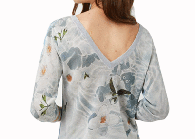 In detail, the top features a stunning sky blue floral print. It is reversible and has a shimmery v-neck with a cinched waist and sleeves.