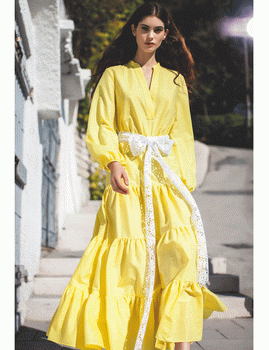 In detail, the dress is made of 100% cotton. It is available in two color options: sunshine yellow and capri blue. The dress is maxi length with a tiered second half. The sleeves puff out and come in at the wrist and there is a modest v-neckline. The dress also has a liner that is seamless with its shape. And it can be worn with or without the laced belt.
