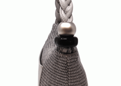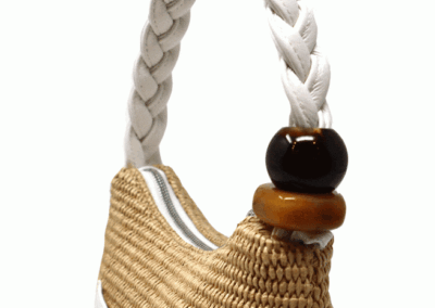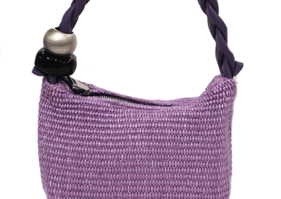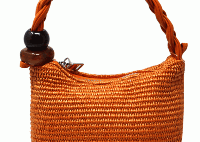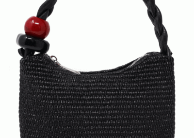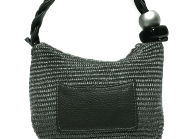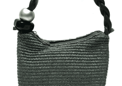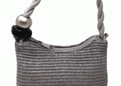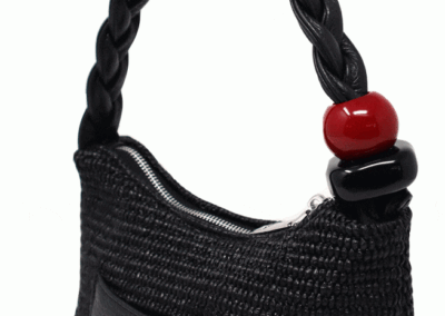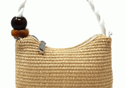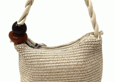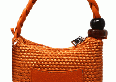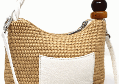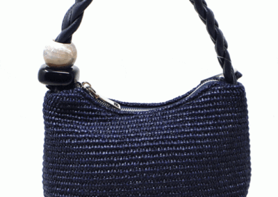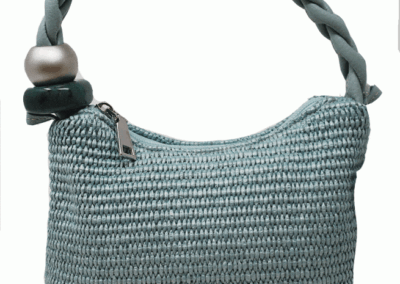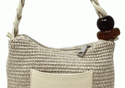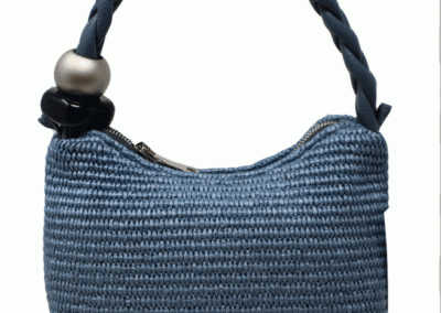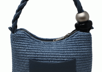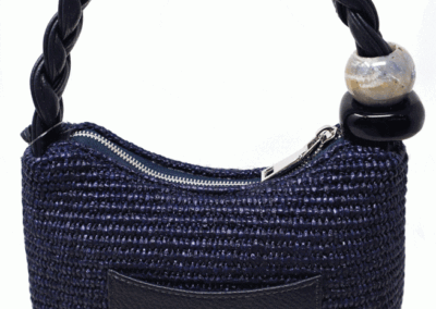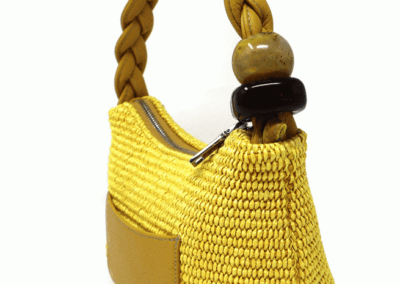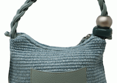 In detail, this handbag comes in eleven colors: yellow, wheat, beige, black, grey, navy, turquoise, blue, rust, green, and lavender. It is handcrafted in Milan and made of embossed leather with nylon and cotton weaving. The handbag features a leather handheld strap with bead accents and it has a detachable leather crossbody strap for desired comfort. The inside is lined with fabric, opens by a working zipper, and has two pockets for additional storage. Also, there is a small pocket on the outside of the handbag for added style and storage.