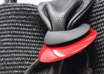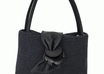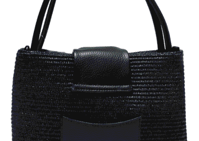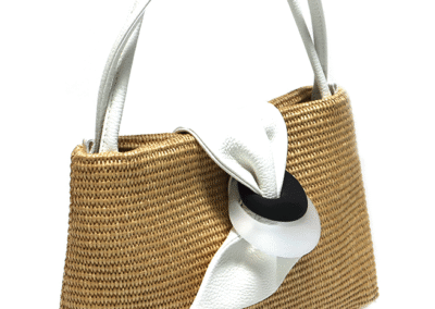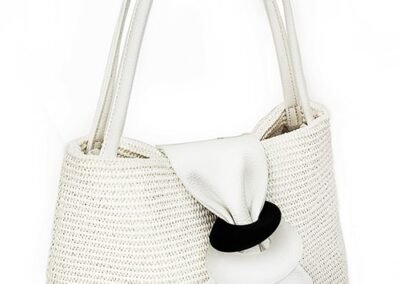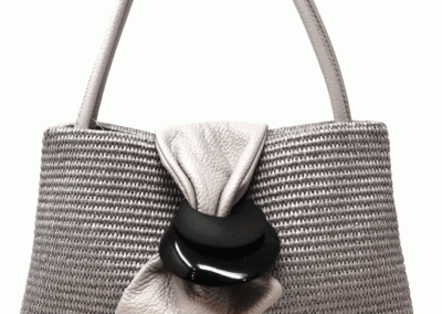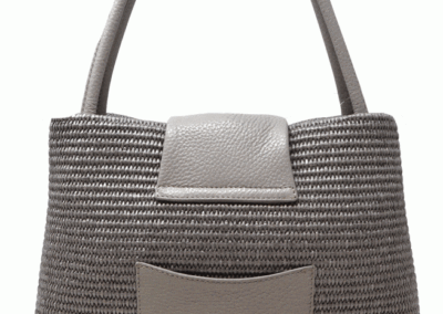 In detail, this handbag comes in six colors: grey, black, beige, wheat, navy, and white. It is handcrafted in Milan and made of embossed leather with nylon and cotton weaving. The handbag features two leather shoulder straps and two large beads held by a leather strap overlay. The inside is lined with fabric, opens by a magnetic clasp, and has five pockets for additional storage. Also, there is a small pocket on the outside of the handbag for added style and storage.