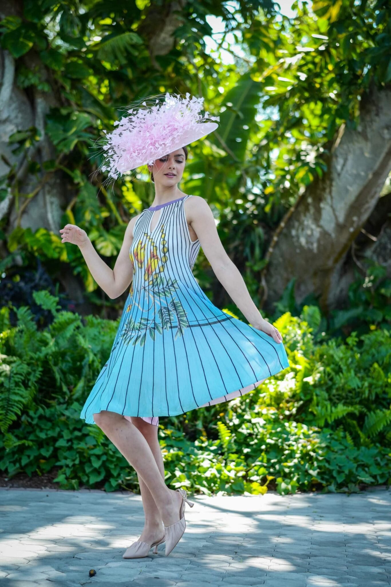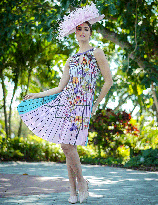 In detail, the dress is reversible with a beautiful yellow floral print. It has a round neckline with a key hole feature and falls at the knee.