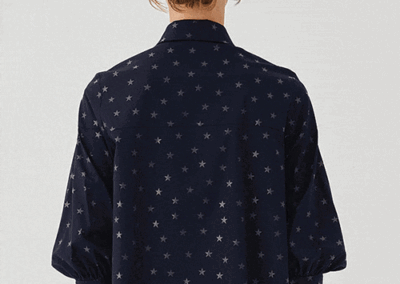 Marilyn's marble navy star blouse is a one of a kind piece. It has a loose fit with long sleeves. The blouse is made of 100% Turkish cotton and has hidden buttons down the front with a chic starred, navy print.