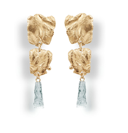 This piece of jewelry is made using lost wax casting techniques. A true handmade sculpture, its very particular crumpled material makes it an emblematic piece of Marion Fillancq’s work. This jewel includes a mirror element cut by hand using prehistoric cutting techniques. Due to the manufacturing process used, each model remains unique. Earrings sculpted in bronze gilded with 24K fine gold, and hand-cut mirror. 925 silver stem. Entirely handmade.