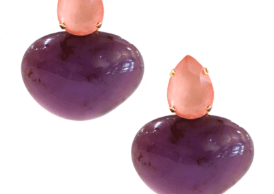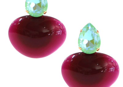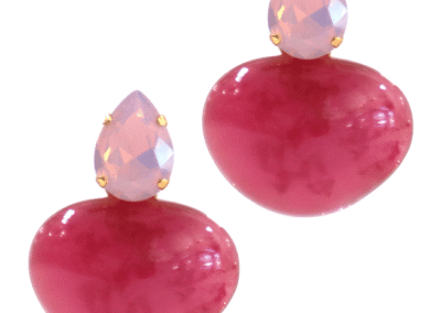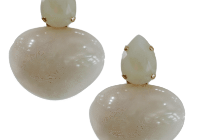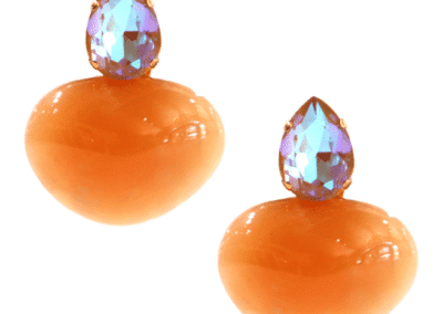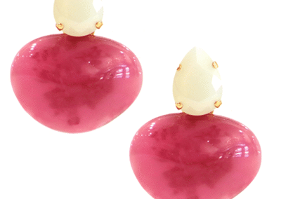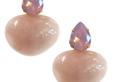 In detail, the earrings are made with resin and Swarovski crystals. They come in ten color options: rose, plum, blush, white, beige, light pink, peach, orange, purple, and yellow. Additionally, metal wiring holds the charms together and clip backings fasten the earrings.