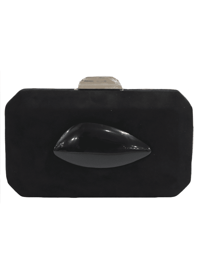 In detail, the clutch is made of a soft suede material and is enclosed by a metal clasp. The front of the clutch features a darling resin charm detail. It can be held by hand, or crossbody and on the shoulder via the metal chain.