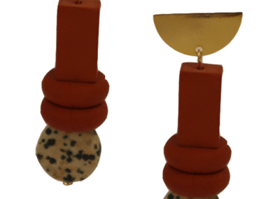 Marilyn's Spanish jasper earrings are made from natural stones, wood, and gold plated, base metals. These earrings and more are part of our elegant collection from Spain, which is 100% recyclable and hypoallergenic. The featured metallic half moon exhibits a smooth surface with a shiny finish. Interestingly, this use of gold and metals dates back to the 5th century in Greece. Additionally, these earrings are long-lasting because they are resistant to corrosion, oxidation, and wear. And the earring is available in five color options: red, grey, ivory, black, and gold.