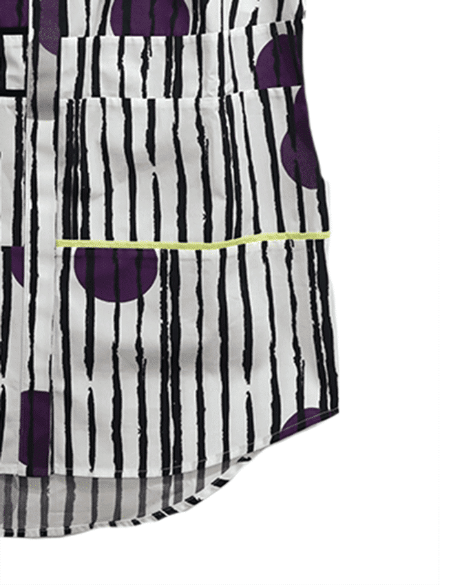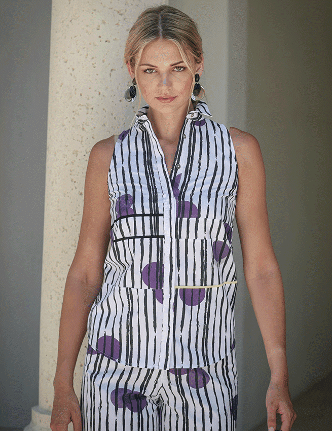 Marilyn's Turkish purple dot blouse is a one of a kind piece. It has a tunic style fit with no sleeves and a structure collar. The blouse is made of 100% Turkish cotton and has hidden buttons down the front.