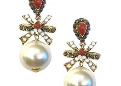 In detail, the earrings are handcrafted with bronze and white Swarovski crystals and resin pearls. Also, they are gold plated and enclosed with metal push backs.