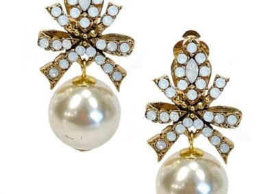 In detail, the earrings are handcrafted with white Swarovski crystals and resin pearls. Also, they are gold plated and enclosed with metal clip backs.